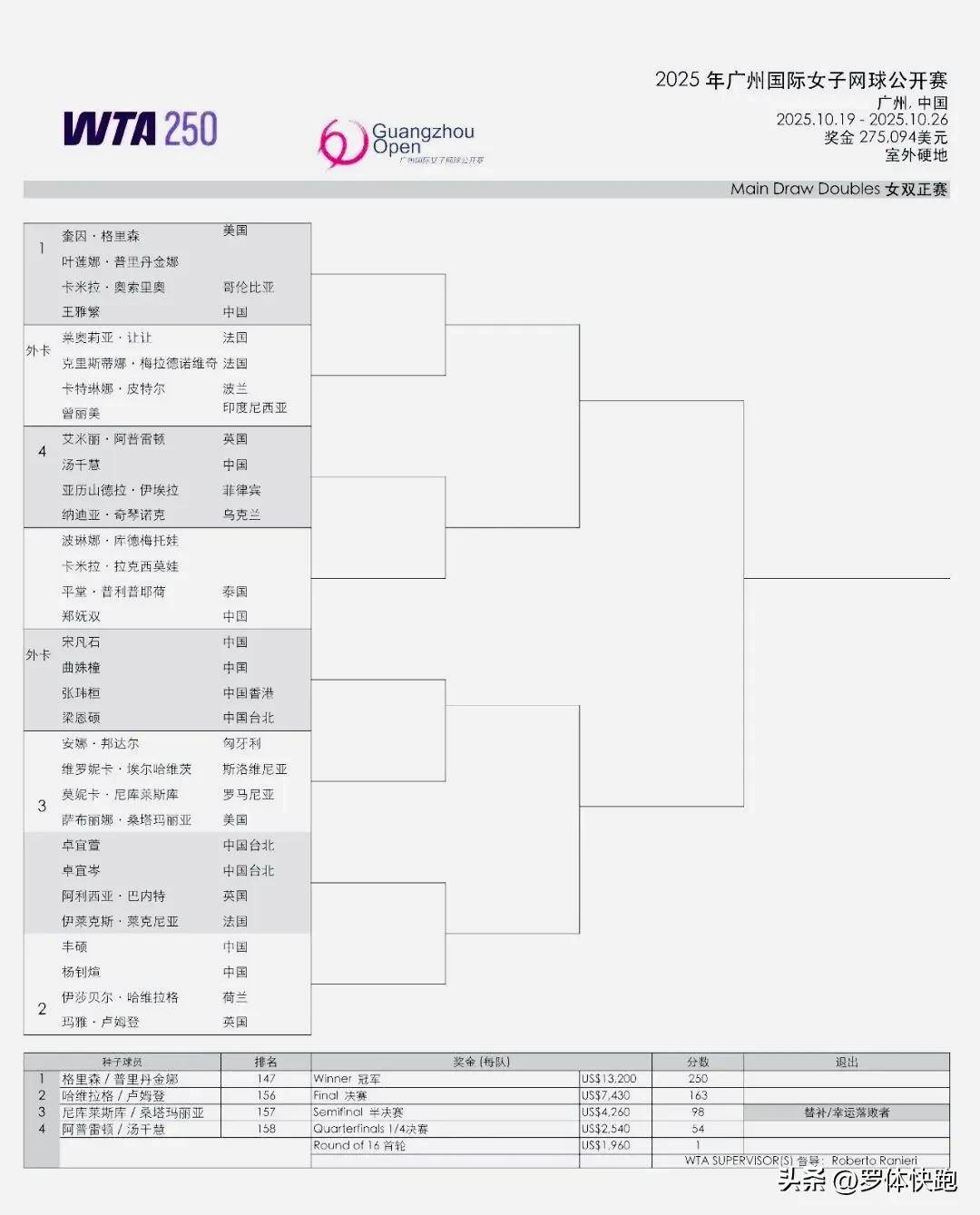 同时,本站的双打正赛签表已经出炉,中国金花组合杨钊煊/丰硕、宋凡石/曲姝橦也将携手参赛,而王雅繁、汤千慧与郑妩双等选手也将组成跨国搭档出战。张帅、王曦雨与朱琳将专注单打赛事。值得一提的是,袁悦与郭涵煜并未出现在资格赛的参赛名单中。