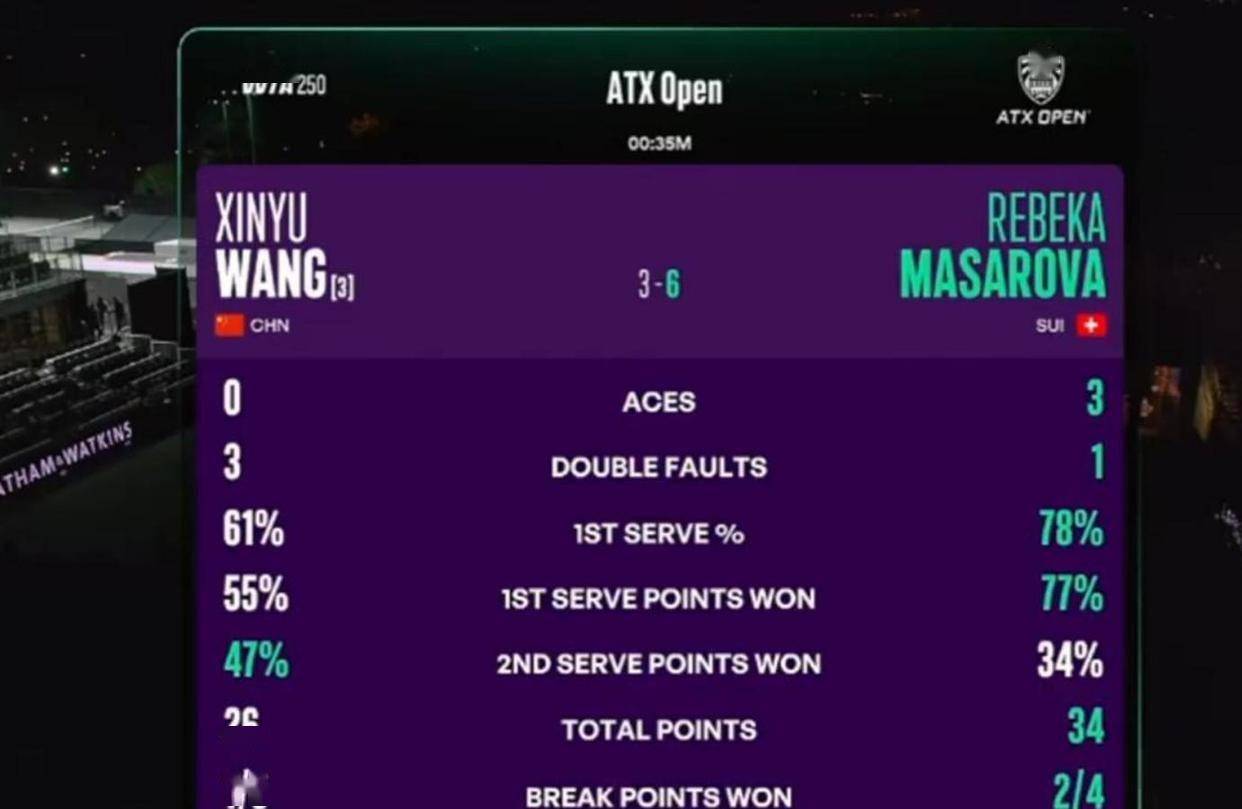 根据赛后更详细的数据,王欣瑜整场比赛的一发得分率只有54%,而马萨洛娃这项数据高达79%。 二发得分率方面,王欣瑜更是以31%对67%大幅落后。在破发点的把握上,马萨洛娃5个破发点兑现了4个,破发成功率高达80%,而王欣瑜仅有的2个破发机会只把握住了1个。