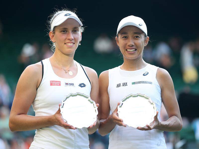 2022年7月10日,张帅(右)/梅尔滕斯在颁奖仪式上。当日,在英国伦敦举行的2022温布尔登网球公开赛女子双打决赛中,张帅(中国)/梅尔滕斯(比利时)组合以0:2获得亚军。新华社记者 李颖 摄