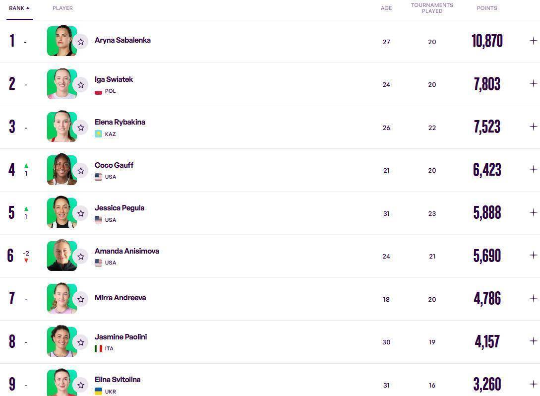 这份新榜单里,前十名的洗牌幅度不小。 美国的可可·高芙和杰西卡·佩古拉各自上升一位,来到第4和第5,使得前十中美国球员达到了三位。