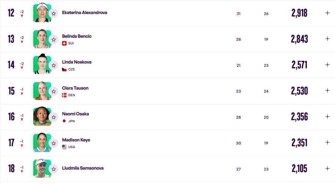 好不容易挤进前十没多久的俄罗斯选手亚历山德洛娃,这次又跌了出来,掉到了第12位。 从第12位到第19位,几乎所有球员的排名都发生了变动,竞争之激烈可见一斑。