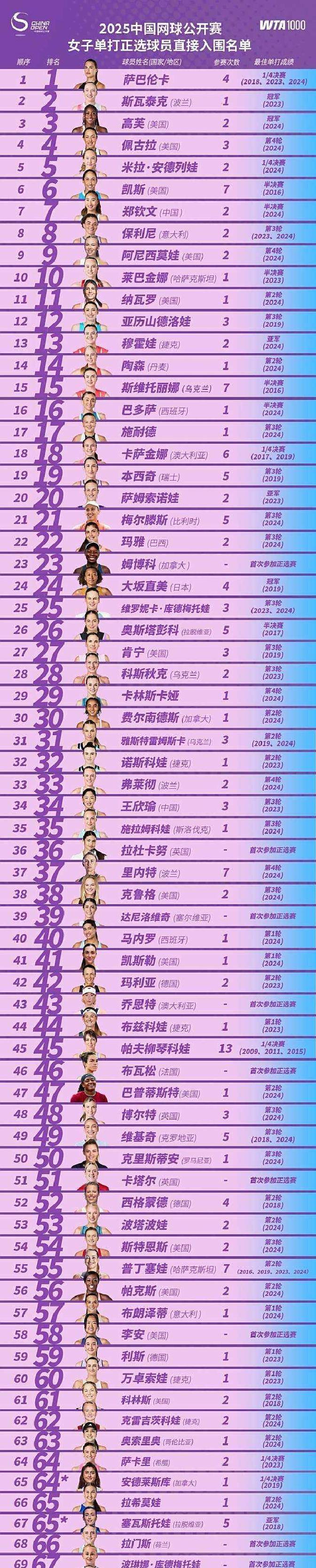 还有一项受关注的赛事,WTA1000级别的中国网球公开赛稍后会举办。女单正选阵容明星很多,好多大满贯冠军和名将都会参赛。世界排名靠前的萨巴伦卡、莱巴金娜、斯瓦泰克还有大坂直美等人都会到赛场,会给观众带来顶级比赛。中国选手里,郑钦文、王欣瑜等能直通正赛。今年中网不但是顶尖选手争冠军的好机会,也是一些球员争赛季总决赛门票的重要比赛。网球迷能在这两场赛事里享受体育盛宴,看到全球网坛明星的巅峰对决。